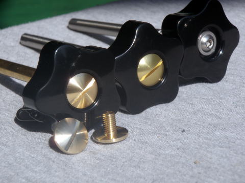 | 各ハンドルのビスがGタイプ(アルミ材にゴールドアルマイト)の注文が多い事から、入荷(社外品)の不安定なGタイプの替わりに、ブラス(真鍮)で専用のビスを製作致しました。 以後、この淡い金色に光り輝くブラスビスを標準仕様とする事に致します。 |